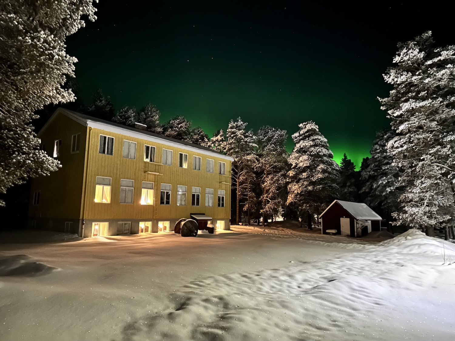 Stay in our lovingly restored village school with private rooms, wood-fired sauna and hot tub overlooking the Vindel River.